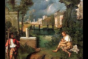 Giorgio da Castelfranco, Giorgione, forma parte, con Bellini, de la primera generación de la Escuela Veneciana, continuada por Tiziano y Tintoretto. Se mantuvo alejado de los grandes encargos de obras religiosas de su época, la renacentista, marcada por la recuperación de la antigüedad clásica. Es reseñable el hecho de que no realizaba bocetos previos de sus pinturas; pintaba directamente, por lo que la espontaneidad es una verdadera característica de su empeño artístico. El examen de la pintura con rayos X mostró que donde aparece el hombre había pintado a otra mujer desnuda.
