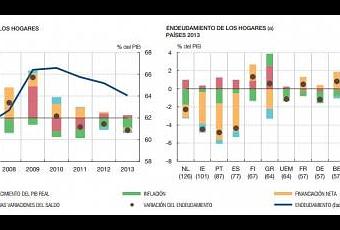 Para el caso español, se puede tomar como referencia del desendeudamiento nacional la evolución del endeudamiento de los hogares. Como se puede leer en el gráfico, los datos del Banco de España no revelan unos niveles de desendeudamiento exagerados. Por el contrario, desde 2009 apenas ha sufrido una reducción del 3%. Además, España sufrió un escueto periodo deflacionario en 2009 que no incrementó excesivamente el valor de la moneda, y fue seguido por cuatro años de reflación. Por lo tanto, podemos concluir que el entrecruzamiento de factores “subordinados” ha facilitado que el sobreendeudamiento en España no haya desembocado en una espiral deflacionaria.