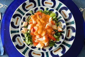 Cóctel de gambas sobre vajilla de Sargadelos en comida familiar.