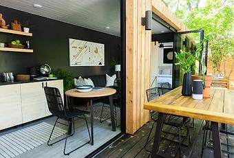Lo más importante en la transformación es sin duda la utilización de revestimientos acogedores, en este caso madera, que camufla por completo la estructura y lo convierte en un lugar cálido y confortable.Además, las aperturas al exterior, puertas y ventanas crean un espacio amplio y luminoso.
