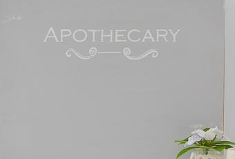 La palabra "Apothecary" la descubrí en Pinterest buscando ideas y nos encantó a las dos. Sugerí algunas tipografías y firuletes y luego calqué y pinté a mano, cosa que amo hacer!