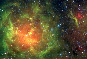 La nebulosa Trífida, también conocida como Messier 20 , es fácil de encontrar con un pequeño telescopio y es una parada habitual en la constelación Saggittarius, rica en nebulosas . Pero mientras las fotografías en luz visible muestran la nebulosa dividida en tres partes por unas bandas de polvo oscuro, esta imagen penetrando en infrarrojo revela filamentos de nubes de polvo brillante así como estrellas recién nacidas. La espectacular vista en falso color es una cortesía del Telescopio Espacial Spitzer. Los astrónomos han utilizado los datos de las imágenes en infrarrojo del Spitzer para contar las estrellas recién nacidas y embrionarias que de otra manera pueden estar escondidas en las nubes de polvo y de gas de esta intrigante guardería estelar. La Trífida tiene unos 30 años luz de diámetro y se encuentra a tan sólo 5.500 años luz de distancia.