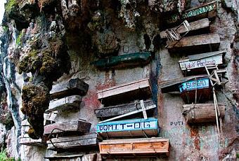 En un país rico en costumbres exóticas, sin embargo no pasa desapercibido su ritual funerario, que busca “acercar” a sus muertos a la luz eterna que les aguarda en el “más allá”. Lejos de cualquier sistema tradicional, no sólo no inhuman a sus muertos sino que cuelgan sus ataúdes en los acantilados de piedra caliza de Echo Valley para que lleguen más fácilmente al cielo, lugar donde viven sus deidades. Pero su tradición va más allá, les exige que el ataúd sea confeccionado por la persona en vida, para lo que usan un segmento de árbol perforado en el centro al que añaden una tapa de madera con dos estacas a cada extremo. Para ellos la vida y la muerte forman un camino que los humanos recorren una y otra vez, por ello cuando fallecen colocan los cuerpos en el interior del ataúd en posición fetal para que regresen al punto inicial en que comenzó su andadura al nacer. Los visten con ropa de colores e insignias para facilitar que sus antepasados los reconozcan. Acto seguido son transportados hasta un acantilado y los sitúan suspendidos en el lugar que les corresponde de la pared de piedra, a varios metros del suelo, para que puedan disfrutar de la naturaleza en compañía de los espíritus que habitan los bosques. Cuanto más altos estén, más fácil llegarán al cielo.