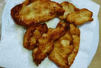 2. Modo jugoso: echamos la sal sobre los filetes, los envolvemos en pan rallado (para que quede más rico, el pan rallado lo podemos mezclar con ajo y perejil en polvo) y los freímos en aceite de oliva, girasol o cualquier otro aceite apto para consumo humano. Cuando esté dorado y hecho por dentro, retiramos de la sartén y lo colocamos en un plato sobre papel absorbente (para eliminar el exceso de aceite), tal y como se ve en la foto.