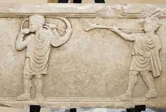 Cornu (izquierda) y tuba (derecha) romanos en un relieve del Museo Ostiense, Ostia Antica, Italia. Instrumentos de viento