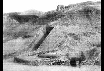 Cuando se descubrió esta nueva entrada a la tumba, me avisaron inmediatamente y procedí con el despacho al Valle. No pasó mucho tiempo antes de que pudiéramos entrar en la tumba. Una escalera áspera conducía a la ladera, llevándonos a la boca de un pasaje que estaba completamente bloqueado por una pared de piedras construidas. Al quitar este muro, nos encontramos en un pequeño pasaje, descendiendo en una pronunciada pendiente hacia una cámara que se podía ver unos metros más adelante. En lugar de este pasaje libre de escombrosSin embargo, como esperábamos al encontrar intacta la pared de la entrada, estaba parcialmente llena de piedras caídas que parecían ser las ruinas de un muro de entrada anterior. Encima de este montón de piedras yacía uno de los lados de un gran santuario funerario, casi bloqueando el paso. Este santuario, como vimos más tarde, tenía la forma de un gran sarcófago en forma de caja, hecho de madera de cedro cubierta de oro, y había sido concebido como una cubierta exterior para el ataúd de la persona fallecida. Sin embargo, no estaba ensamblado: tres lados estaban apoyados contra las paredes de la cámara funeraria, y el cuarto estaba en el pasillo. O bien nunca se acumuló, o bien estaba en proceso de ser sacado de la tumba de nuevo cuando el trabajo fue abandonado.