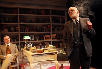 Hay magníficas funciones de teatro que se convierten en extraordinarias por alguno de los elementos que en ella intervienen. Es lo que sucede con «La última sesión de Freud», un magnífico y sencillo espectáculo que se convierte en sobresaliente por la memorable encarnación de Helio Pedregal hace del padre del psicoanálisis, Sigmund Freud. Desde la primera fila, a apenas un metro de distancia, donde la verdad y la mentira del actor no puede ocultarse, el trabajo de Helio Pedregal resulta verdaderamente prodigioso.Siempre he admirado a Helio Pedregal, un actor callado, discreto, pero de una infrecuente calidad y que ilumina cualquier reparto, ya sea en el teatro, su habitat natural, como en sus contadas apariciones en el cine y la televisión. Seriedad, profundidad, rigor, análisis, naturalidad, son las armas con las que Pedregal afronta siempre sus interpretaciones. En su encarnación de Sigmund Freud ha ido incluso más allá, con una transformación física absolutamente pasmosa (el parecido con el psiquiatra vienés es extraordinario) y un trabajo de composición del personaje que le ha llevado (espero no revelar ningún secreto) a trabajar con fundas en los dientes para tratar de aproximarse a los dolores que Freud, enfermo de cáncer de boca, sentía en el final de su vida. Si a ello se le añaden las habituales virtudes del actor antes expresadas, el resultado es una actuación memorable.
