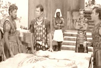 - Marco Antonio en una escena del film Cleopatra (1963), discutiendo sobre el plan de la batalla de Actium. En la maqueta se aprecia la colocación de las flotas enemigas situadas justo ante la boca del Golfo de Ambracia, bloqueando la salida del mismo, tal y como narran las fuentes: “delante de la boca del golfo“i