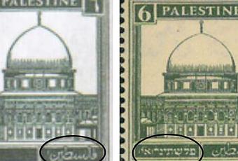 sello británico de la época del Mandato. A la derecha, los tres idiomas incluidos en el sello original. A la izquierda, el sello adulterado utilizado en los libros de texto palestinos, borrando por completo el hebreo