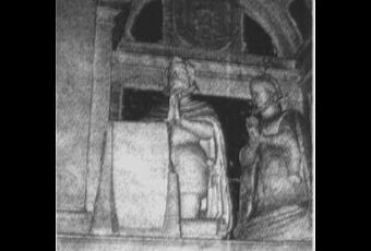 Ya hacía unas horas que había anochecido cuando los oficiales amigos del capitán se presentaron en S. Pedro Mártir. El dragón les llevó al centro de la iglesia donde una fogata ardía con los restos de coro, bella obra de arte que se consumía para dar calor al ejercito invasor. Bebieron un poco y luego el capitán les llevó a ver la estatua. Les dijo que ya había conseguido saber quien era por las inscripciones en latín que había en la tumba.