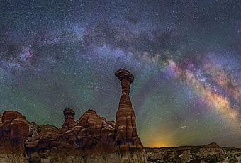 La imagen muestra el disco central de la Vía Láctea que se arquea por encima de las formaciones rocosas Toadstool que hay en el norte de Arizona (EE.UU.). Las insólitas capas de los Toadstool son gres relativamente duro que el viento ha erosionado más lentamente que el gres más suave que hay debajo.