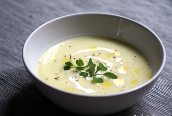 En primer lugar picáis la cebolla y la sofreís con la mantequilla. Cuando esté transparente agregáis el puerro picado y lo pochais por unos minutos. Entonces añadís las papas y cubrís con el caldo. Dejáis que se cueza todo unos 30 minutos y trituráis bien hasta dejarla bien fina, con la ayuda de un brazo. Después agregáis la leche y volvéis a pasar la batidora hasta que quede una crema muy homogénea. Por último, cuando se haya enfriado un poco, salpimentáis y termináis con la nata.