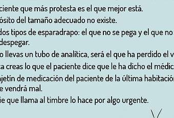 De poco o nada le ha servido la teoría que estudió en la carrera, por eso ella crea su propio decálogo, que aquí os dejo, sus propias normas. Unas pautas que le ayudan a lidiar con pacientes que se empeñan en decirle dónde tiene que pinchar para sacarles la sangre o que tocan el timbre de la habitación para cosas sin importancia, por no hablar de los familiares y el resto de compañeros, especialmente los médicos.