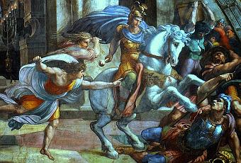 (Detalle del fresco Expulsión de Heliodoro, Estancia de Heliodoro, Salas de Rafael, Vaticano, Roma; Vista general de la Estancia decorada, Vaticano, Roma; Fresco Expulsión de Heliodoro, 1512, Rafael Sanzio, donde participó también su discípulo Giulio Romano, Estancias Vaticanas, Roma; Óleo de Giulio Romano, Mujer ante el espejo, 1524, Museo Pushkin, Moscú; Autorretrato de Rafael con Giulio Romano -éste a la derecha, el más joven-, 1518, Museo del Louvre, París; Fresco decorado de Giulio Romano, Sala de los Gigantes, 1528, estancia interior del edificio renacentista, diseñado por él mismo, Palacio de Te, Mantua, Italia.)