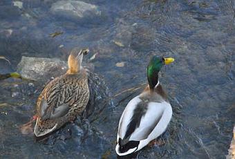 Los patos nadan a contracorriente ascendiendo río arriba unas decenas de metros... Después el pato macho se aleja volando dejando sola a la pobre pata y la pequeña Ainoa, triste, vuelve la cabeza buscando otras parejas río abajo.