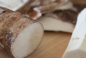 Las raíces son tuberosas variando en número de acuerdo con el cultivar y generalmente presentan un crecimiento en dirección oblicua. Miden de 20-40 cm de longitud y 5-20 cm de diámetro. El color externo es café y el interno puede ser rosado, blanco, o crema amarillo. La profundidad del sistema radicular alcanza hasta los 2 m ocupando las raíces reservorias los primeros 50 cm. empleada en Sudamérica desde mucho antes de la colonia, como parte importante en la alimentación de las tribus, se cree que es originaria de Brasil. Es una raíz de forma elongada cubierta por una cáscara áspera de color rosado/café; su densa y fibrosa pulpa es de color blanco.