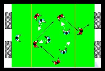 Ejecución: Juegan 5×5 Todos los jugadores excepto uno por equipo (zona de finalización) Compiten en la zona central entre ellos. El equipo poseedor del balón deberá enviar éste antes del 5-6 pase, al compañero situado en la zona de definición. Debiendo el equipo contrario evitarlo y permitir que el jugador atacante consiga hacer gol en cualquiera de las dos.Tiempo: 2×10´