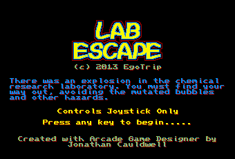 Como su nombre indica, en Lab Escape tendremos que escapar de un laboratorio antes de que explote, sorteando enemigos y peligros como llamaradas, piscinas ácidas, burbujas mutantes (¿?)... y de paso hacernos con todas las monedas que encontremos en nuestro camino. Existen algunas limitaciones como el uso forzoso del joystick para controlar a nuestro personaje impuestas por el propio AGD, y seguramente subsistan algunos bugs de los que el autor estará más que encantado de conocer para tratar de arreglarlos.