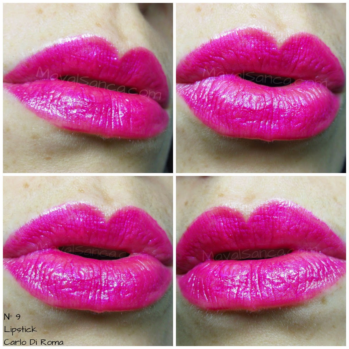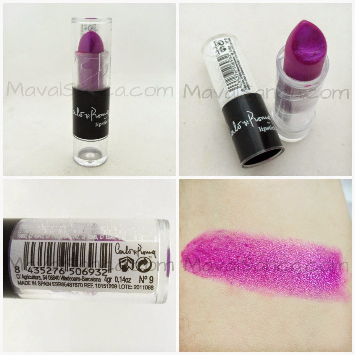Carlo di Roma es una marca que lleva toda mi vida a la venta.Recuerdo que los primeros productos que me compré fueron de esta marca. Concretamente era un trío de sombras de ojos blanca, gris y negra (que aún tengo pero ya no uso).Hace tiempo leí que esta empresa había quebrado porque lanzó una línea de cosmética de precio más elevado que no tuvo éxito.Me dio pena, siempre me da pena que una empresa española cierre, pero más por este tema sentimental.Sin embargo sigue a la venta y por eso pude comprar el labial del que os hablo hoy.Lo compré por el precioso color que podéis apreciar en la barra y el swatch.Un rosa fucsia violáceo con destellos azulados y violetas.No tenía ninguna esperanza de que pigmentara bien y que se pudieran apreciar los destellos una vez aplicado en los labios.Carlo di Roma is a brand that has been sold my entire life. I remember the first products I bought were of this brand. Specifically was a trio of eye shadows in black, white and gray (still have it but not use it). Some time ago I read that this company had gone bankrupt because it launched a line of cosmetics of higher price unsuccessful. I felt sad, always makes me sad that a Spanish company close, but more for the sentimental theme. But are still for sale and so I could buy the lipstick of which I speak today. I bought it for the beautiful color that you can see in the bar and the swatch. A purplish fuchsia pink with blue and violet hues. I had no hope that its pigmentation was well and could see the sparkles once was applied on the lips.
