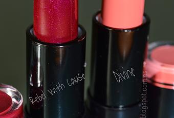 Son dos texturas completamente distintas, pero en ningún sitio de los envases pone nada de su textura. El acabado del tono Rebel with Cause es muy hidratante, se desliza muy libero al utilizarlo y se nota el labio hidratado. Su cobertura es media y con el paso de las horas deja el labio teñido.Por el contrario el tono Divine es mate, de textura como todos los mates: seca. La verdad es que pensaba que me gustaría más. Dura más tiempo en el labio pero también reseca y se nota mas las pilecillas. De todos modos sólo me ha dado tiempo de usarlos un par de veces, ya os iré contando que tal me van.