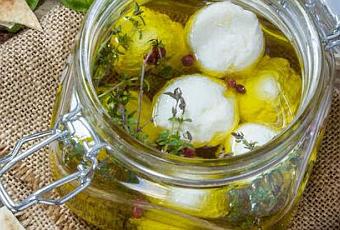 9. Ahora conservamos nuestras bolitas de labneh en un tarro de cristal hermético y las sumergimos en aceite de oliva virgen extra. Podemos aromatizar con pimienta rosa y tomillo fresco cualquier hierba de tu gusto. También puedes optar por simplemente rebozar las bolitas en pimenton picante, semillas de sésamo blanco o negro, orégano seco, sumac....
