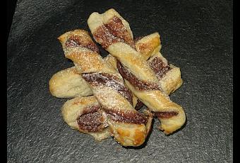 Extendemos la masa de hojaldre y la partimos en dos mitades, pintamos con un poco de leche y azúcar y añadimos chocolate en una de las mitades. Luego ponemos la otra por encima. Cortamos en rectángulos y los enrollamos como si fueran trenzas cada uno de los rectángulos. Pincelamos con un poco de leche y metemos al horno a 180ºC durante 20 minutos, sacamos y adornamos con azúcar glass.