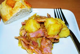 Simplemente troceamos las patatas y el lacón, echamos el pimentón y movemos para que se reparta bien. Aceite de oliva y sal a gusto (yo utilicé sal gorda de Ibiza que compramos allí este verano, pero la venden en muchos sitios).