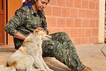 Una combatiente kurda junto a su perro en Qahtaniya, en la frontera entre Siria y Turquía, el 13 de febrero de 2015.Fotografía © AFP/Archivos | Delil Souleiman Anuncios