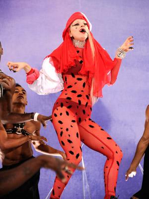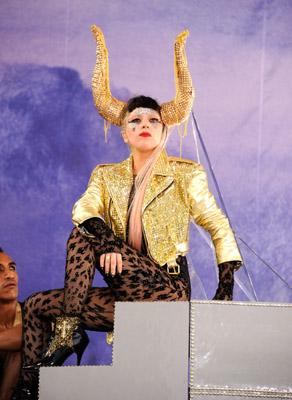 La cantante no defraudó y lució algunos de sus espectaculares outfits en negro, rojo y dorado: ajustadas mallas, chaquetas "picudas", cuernos dorados y su ultimo peinado, una peluca bicolor en blanco y negro.