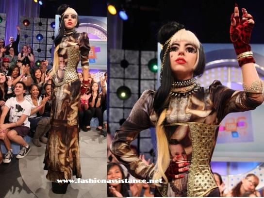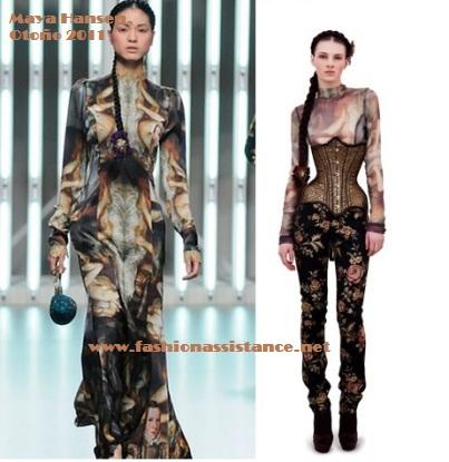 La diseñadora y corsetera Maya Hansen, es la autora de este vestido que lució Lady Gaga en la grabación de un programa de televisión. Hansen desfila en la pasarela El Ego en Cibeles Madrid Fashion Week. El vestido pertenece a la colección "Reinas de España", Otoño/Invierno, 2011-2012 y tiene impresas imágenes de reinas y el cuerpo en forma de corsé. Creo que esta aparición de la cantante dará una tremenda publicidad a la diseñadora española. Felicidades!