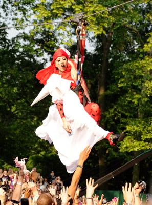 Lady Gaga continúa siendo una fuente de sorpresas y sigue asombrando en cada una de sus apariciones públicas. Ayer y para participar en el show de ABC "Good Morning América" no se le ocurrió mejor idea que descolgarse mediante un cable envuelta en uno de sus estilismos imposibles y "volar" por encima de sus fans, que la aclamaban emocionados.