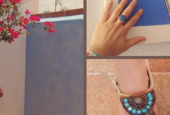 On the terrace walls, in an oil painting done by moi - and that lovely Elephant shaped ring- aswell as on my sandals embellishments.En las paredes de la terraza, en una pintura al óleo hecha por mí, (aquí en la foto "enmarcada" por mi mano y el simpatiquisimo anillo de elefante), así como en los adornos de mis sandalias.