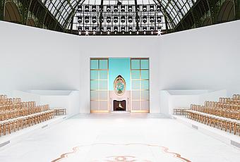 La pasarela, se transformó en una recreación de un proyecto que el arquitecto suizo hizo para el aristócrata Charles de Beistegui. Un espacio abierto al cielo de Paris, rodeado por unos muros que escondian la ciudad y solo relevelaban discretamente los grandes monumentos del skyline parisino. En la paserela como en aquél ático en un lugar central y como protagonitas se colocaron una chimea y un espejo ovalado sobre el cual esta vez se reflejaba la insinia de las dos ces entrelazadas.