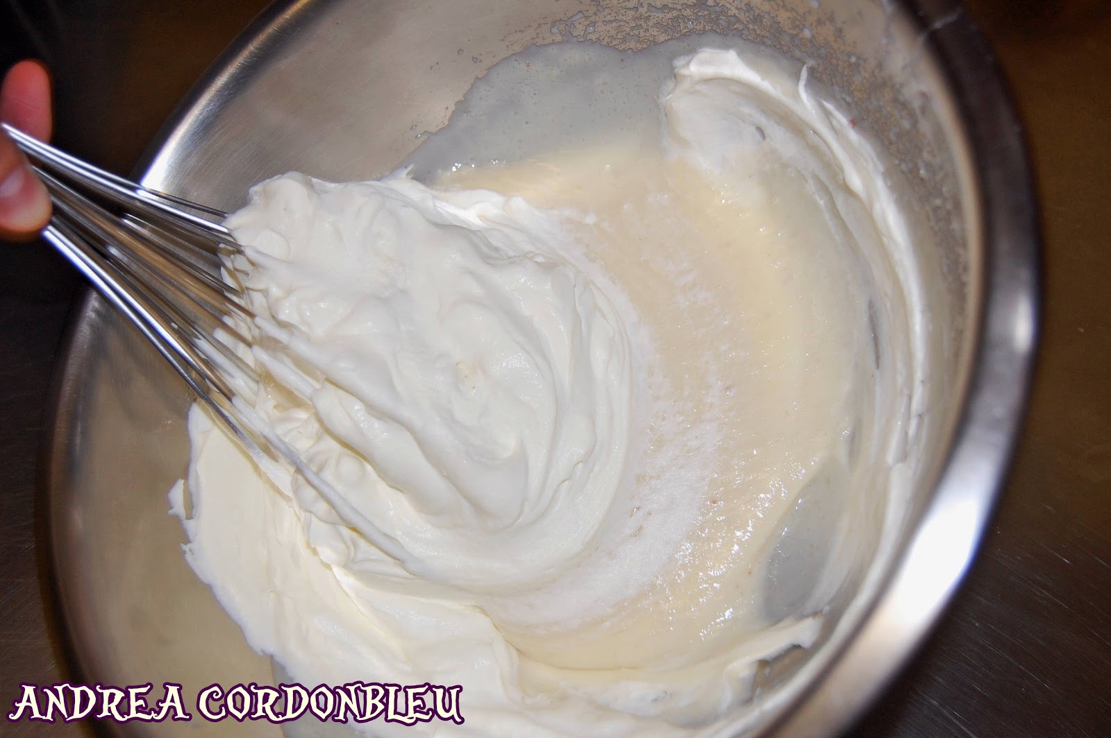 Una vez listo, se tritura y se añaden las hojas de gelatina previamente hidratadas. Se deja templar.Se monta la nata y se incorpora con movimientos envolventes. Se montan las claras a punto de nieve y también se incorporan de manera envolvente. Se deja enfriar en la cámara.