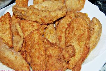Primero se puede pasar el pollo por las especias. Este paso es opcional. Se pasan las tiras de pollo por huevo batido y por el pan rallado con las especias.