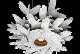 Esta lámpara colgante tiene un diseño singular muy bien logrado, es un conjunto de manos en gesto de salud, irradiadas y en color blanco. La pieza tiene valor escultórico artístico y es todo un mensaje. Además la impresión que causa lleva a asociar las manos blancas con palomas y la paloma blanca es el símbolo de la Paz.