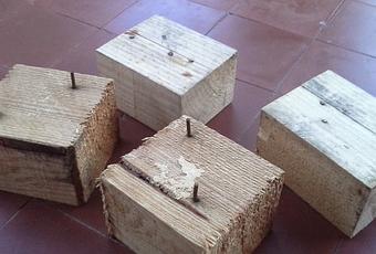 Con lana le hice la tulipa. Para ello utilicé otro taco de palé. Lo envolví en celofán, y sobre él, fui enrollando la lana. Una vez tubo el aspecto que buscaba la empapé con cola blanca rebajada con agua. Y cuando se secó le di bien de cola blanca sin rebajar para reforzarla.
