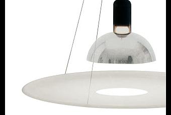 La lámpara está formada por tres elementos claramente diferenciados, la elegante pantalla de metal con el interior pintado en blanco, rodeada por tres varillas de acero de carbón que sujetan el elemento más característico de este diseño, el reflector hecho de vidrio opalino, con una forma que nos recuerda a un frisbi, situado bajo la luz y cuya función es distribuir la luz de una forma agradable.