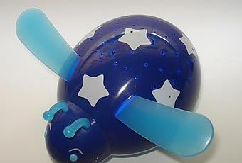 La lámpara se supone que simula a una abeja, aunque creo que el parecido es más bien remoto. En cualquier caso, no es fea, incluso sin encender, aunque sí la veo un poco de plastiquillo malo. Para encenderla y que se proyecten estrellas y lunas basta con tocar levemente en una de las estrellitas que tiene en el lomo. Con cada toque se iluminan de un color distinto o con una combinación de ellos.