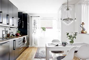 Algunas han sido rescatadas directamente de décadas pasadas (las de color bronce sobretodo, en este piso sueco la lámpara del salón por ejemplo) y otras reinterpretadas en colores actuales (negro, azul o rojo) y con los 'cristales colgantes de plástico' (veréis un ejemplo de éstas en el salón cubierto en la terraza).
