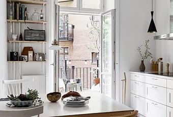 En los países nórdicos son más habituales partes de la cocina sin muebles superiores, una opción que deja espacio para tener lámparas colgantes sobre la encimera.