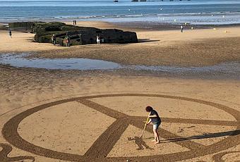 En la playa de Gold (Arromanches les Bains - Normandie) aún pueden verse los restos del antiguo puerto Mulberry, improvisado para asegurar la intendencia que habría de traer el éxito a la Operación Overlord, durante la Segunda Guerra Mundial.El día que tuve la suerte de visitar tan emblemático lugar redoblé fortuna al contemplar que una mujer dibujaba el emblema de la paz sobre la arena, precisamente de esta playa, durante el tiempo en que se prolongó mi estancia... Fue un momento mágico que disfruté desde una terraza, extasiado, saboreando cada gesto, sonido o destello...El Land Art es un movimiento de arte contemporáneo que promueve la reflexión sobre la importancia de preservar el medio ambiente (u otros valores, en esta ocasión la paz) mediante intervenciones en el paisaje hasta conseguir una obra de arte... Tuvo su inicio en 1968 con la exposición Earthworks en la Candace Dwan Gallery de Nueva York a través de uno de sus mayores exponentes: Robert Smithson, aunque bien podría pensarse que sus primeras manifestaciones son mucho más antiguas, desde obras como los geoglifos de la cultura Nazca (líneas de Nazca - Perú)...