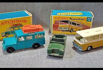 La pieza #12 de Matchbox estaba presente en los catálogos, de la empresa británica, Lesney Products & Co. Ltd. desde el año 1955, cuando solo era 18 modelos. En este caso vemos las piezas #12b, #12c y #12d, que son el Land Rover Serie II, el Land Rover Safari y el Setra S80.