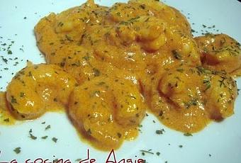 La foto no está muy bien que digamos, pero el sabor queda muy muy bueno. A ver si os gusta!- Preparar una salsa pochando en aceite 2 dientes de ajo, ½ cebolla y ½ guindilla. Añadir una copa de brandy y dejar evaporar. Echar un bote de 250 grs. de tomate frito y un brick de nata. Cocer un poco y pasar por la batidora, quitando la guindilla. Añadir 24 langostinos pelados, dar un hervor y espolvorear con perejil.