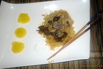 Como producto de temporada, aunque ya casi ha llegado a su fin he elegido unas setas perretxicos, aunque en este caso deshidratadas, pero es una forma de tener setas siempre a mano y en cualquier época del año. La parte oriental de la receta la aportan los noodles y algunas de las especias.