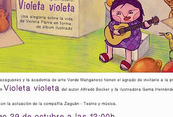 El próximo domingo, 29 de octubre, tendrá lugar el lanzamiento del álbum infantil "Violeta violeta" en Madrid, a las 12:00 del mediodía, en la academia de arte Verde Manganeso, C/ Mauro nº6, metros Prosperidad o Cartagena.