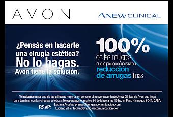 AVON nos promete tener entre sus manos el "Lanzamiento de la década" y va más allá. Nos ofrece en exclusiva conocer y testear antes que nadie su nuevo producto. Algunas de las características que lo definen: revolucionario, hallazgo científico, marcador de tendencia. Se trata de Anew Clinical Serum Dermocosmético con A-F33, Amino-Fill 33 (molécula registrada por Avon para reducir arrugas finas, disminuir manchas y mejorar la textura de la piel). Es ideal incluso para pieles sensibles. Y lo mejor es para todas sin discriminar rango etario. Con este lanzamiento incursiona en el segmento de la dermo cosmética a partir de una alianza con los renombrados laboratorios NeoStrata (compañía líder en descubrimientos tecnológicos), inspirada en una investigación ganadora de un Premio Nobel.