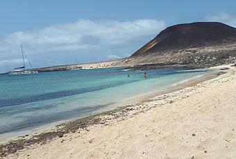 Su extensión abarca 27 kilómetros cuadrados y ofrece la gama de colores africanos del Sáhara y de los volcanes canarios: ocres, amarillos, turquesas y pardos aturden la mirada del visitante. El mar moja las mejillas doradas de la playa de La Francesa, que suspira bajo la Montaña Amarilla. El aliento de este volcán, y de otros como la Montaña Bermeja, ahora no quema, pero derramó por sus laderas su llanto de genistas (el amarillo de Serrat en su Mediterráneo). Llegar desde la Caleta de Sebo hasta la playa de la Francesa supone una caminata de media hora, mientras, desde arriba, al otro lado del mar nos espía el disimulado vigilante Mirador del Río, hábilmente camuflado por una visera acristalada, en los riscos de Famara. Antiguos piratas buscaban refugio entre Famara y La Graciosa.