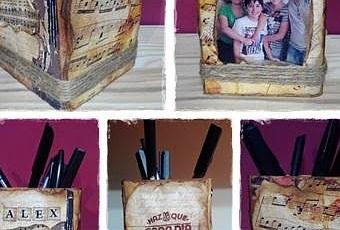 He hecho este lapicero para Alex. Es un lapicero de madera, en crudo, que decidí decorarlo con sus cosas favoritas, la música y la geografía.