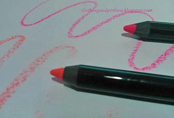 Son perfiladores de labios waterproof con una textura algo cremosa (pero no demasiado) que se deslizan perfectamente por el labio, un trazo nítido sin necesidad de estar repasando las lineas. El color queda perfecto y muy parecido al del lápiz (por lo menos en mi labio). Pero lo mejor de estos lapices es sin duda su duración, quedan perfectos durante horas sin moverse ni desaparecer, incluso comiendo y bebiendo. Los he usado solos con un poquito de bálsamo transparente encima o con labiales haciendo que estos últimos duren muchísimo mejor. Los tonos que os enseño son el 18C un naranja neón yel 16C un rosa fucsia bastante potente